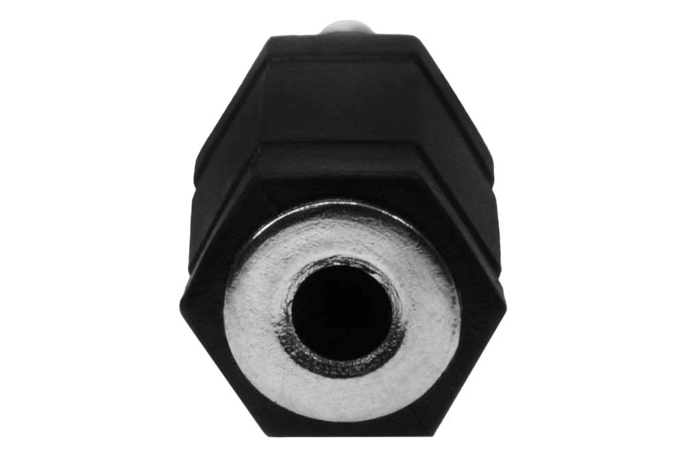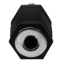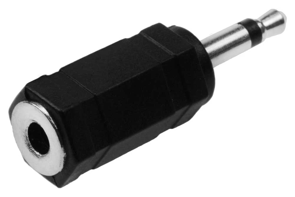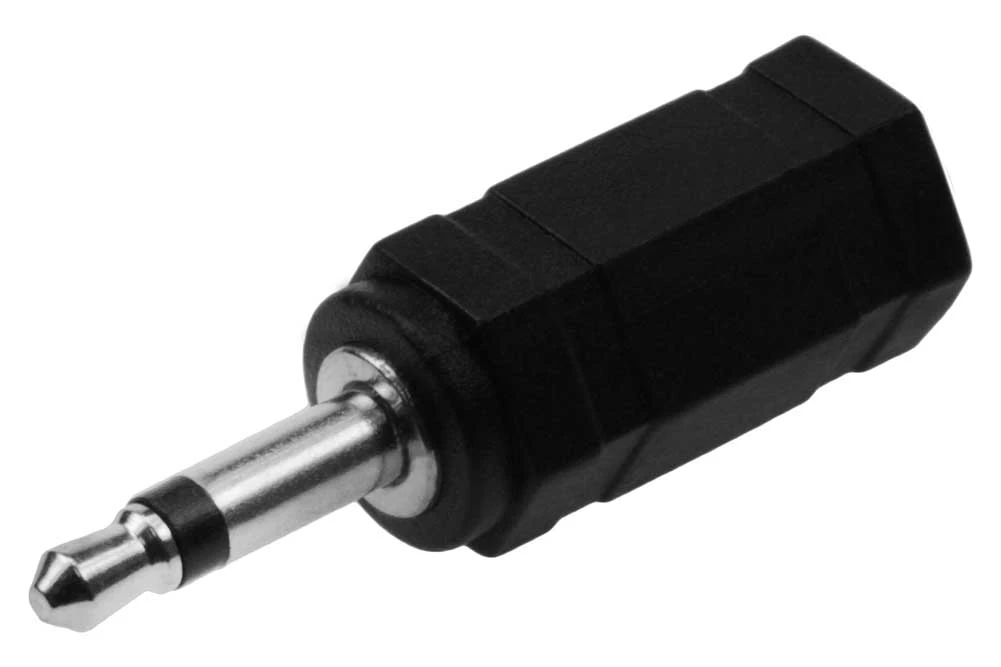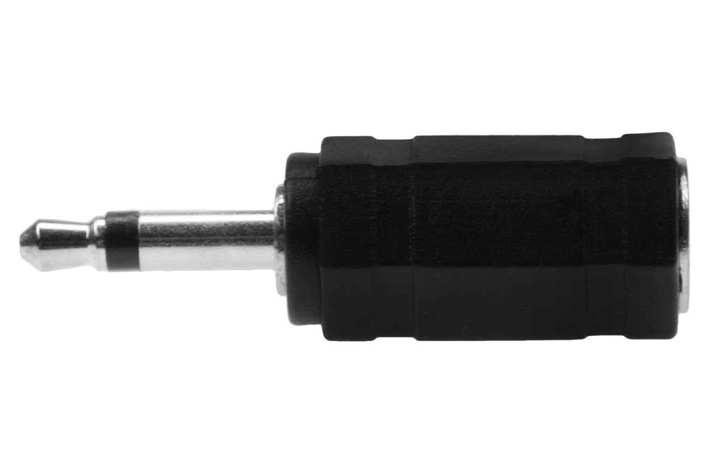 Audio/Video Adapter. 3.5mm Stereo Jack (Female) to 3.5mm Mono Plug (Male). Black molded plastic construction. Nickel-plated contacts.