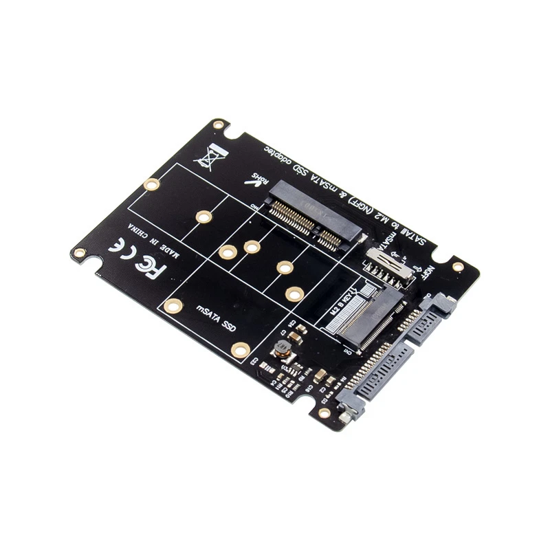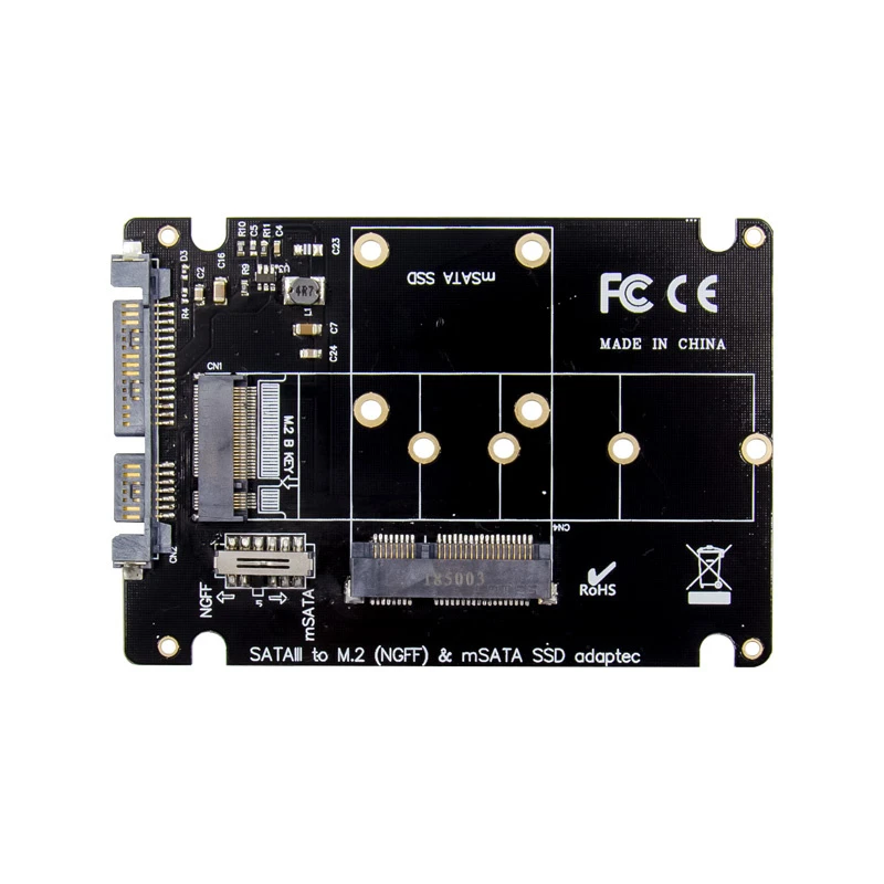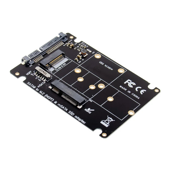 The CPC-98525 SATA to M.2 or mSATA adapter is an SSD multi-function card, which can support an M.2 Key B SATA protocol SSD or an mSATA SSD. It complies with the Serial ATA rev3.0 specification, and is backward compatible with SATA-II and SATA-I. The data transmission speed is up to 6Gbps, which can be used in laptops, desktop computers, small computers and other devices.