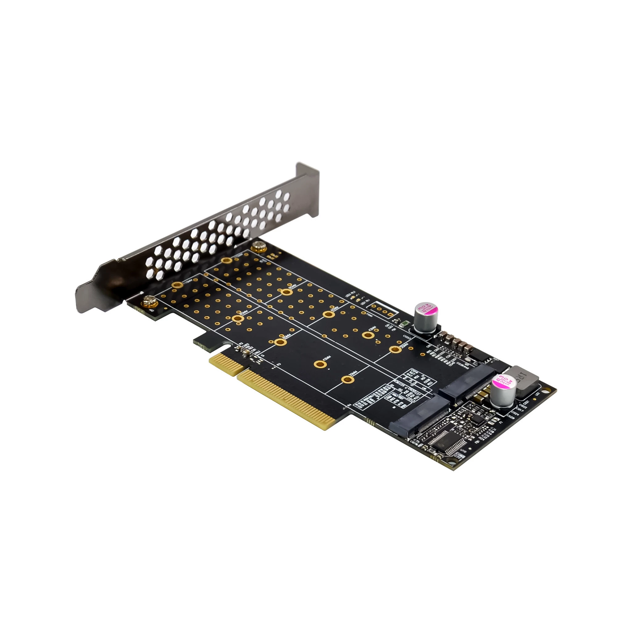 This PCIe x8 2-Port Hyper M.2 NVMe SSD Adapter is connects directly to the motherboard, It has support with ultra-fast PCI Express V3.0 X8 lanes transmit bandwidth up to 64Gb/s, through Hyper M.2 technology is used to connect multiple SSDs , then it can be support with two M.2 PCIe protocol NVMe SSD drive . By this adapter can be improved system speed ,and improved the efficiency of office and entertainment.