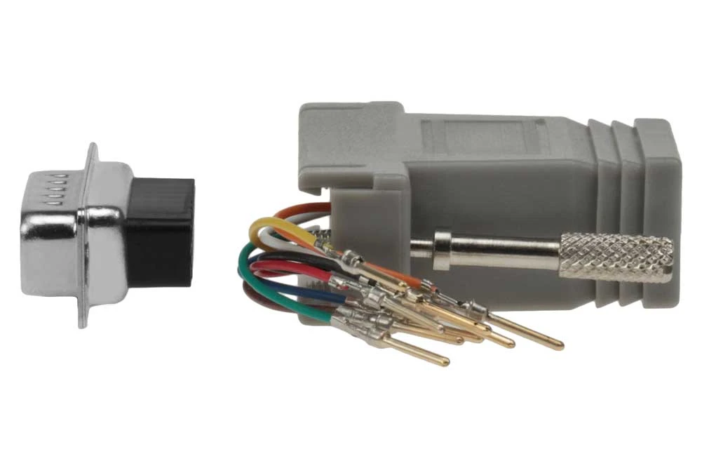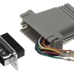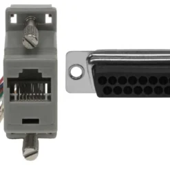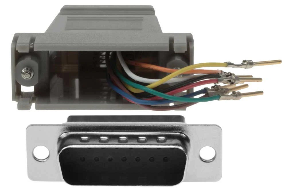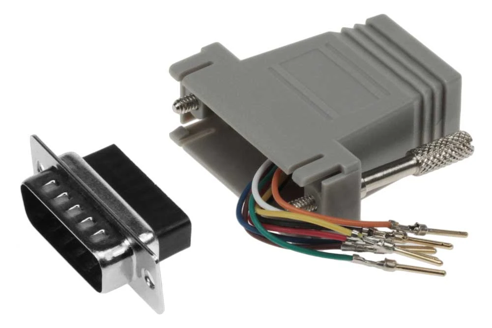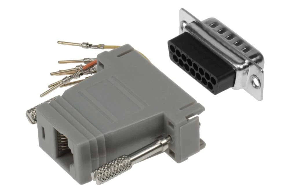 This modular adapter has a DB15 Male connector that plugs into DB15 port and converts it to an RJ45 connection.