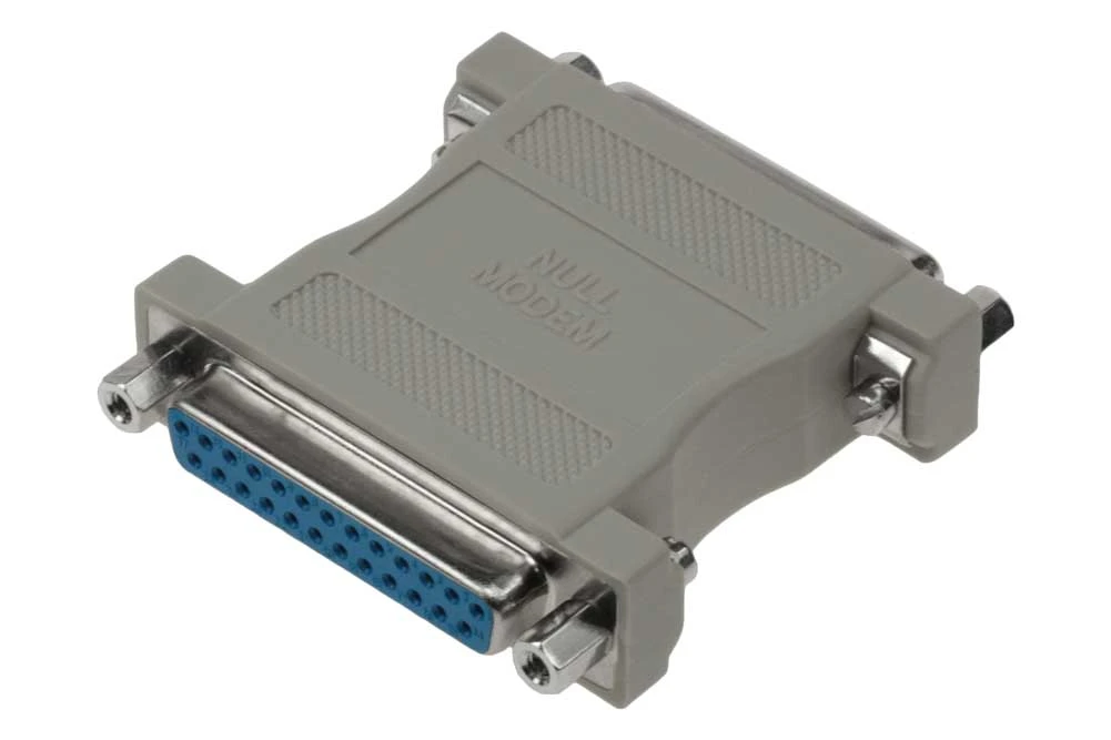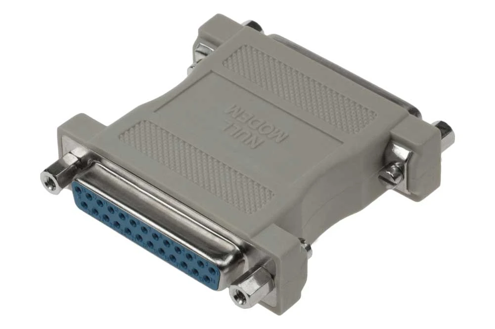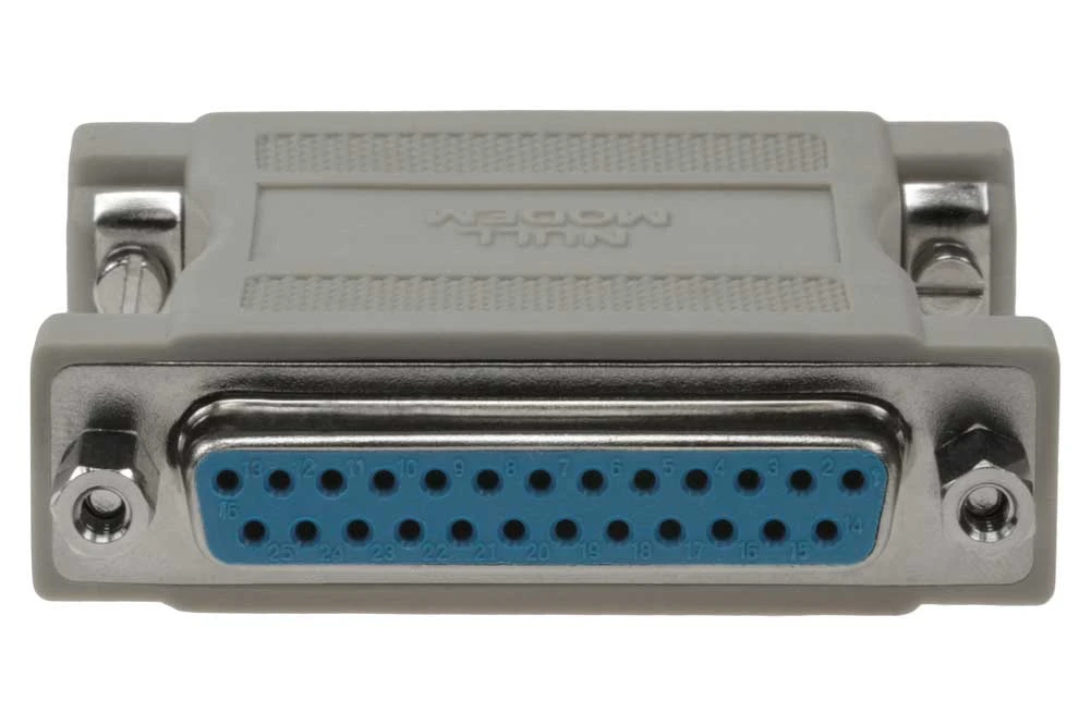 2 x DB25 Female. Type: Null modem Adapter. Convert your existing serial cable into null modem (cross-over) cable. Fully molded and protect against unwanted EMI/RFI.