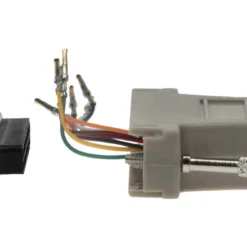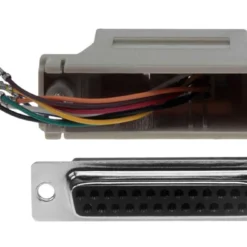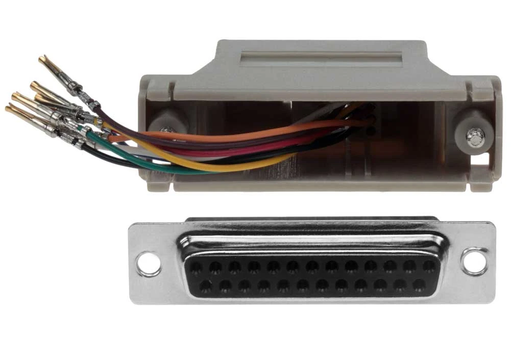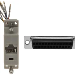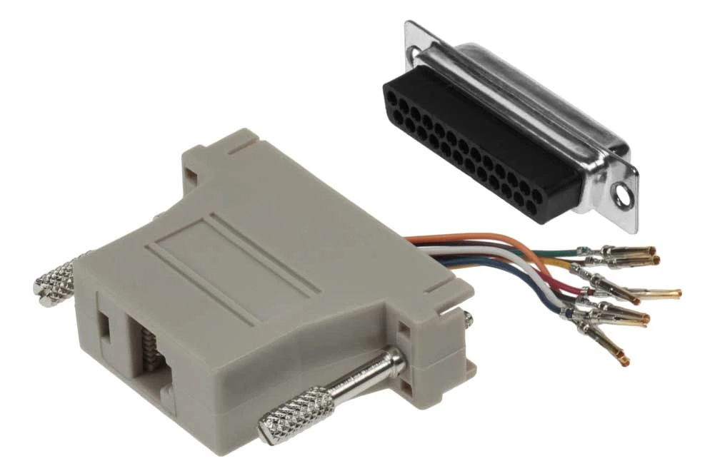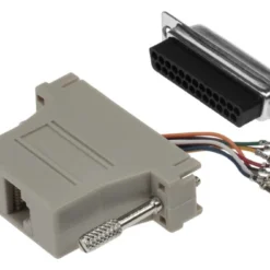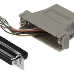 This modular adapter has a DB25 Female that plugs into DB25 RS232 serial port and converts it to an RJ45 connection. RJ45 Pinout: Pin1 – Blue Pin2 – Orange Pin3 – Black Pin4 – Red Pin5 – Green Pin6 – Yellow Pin7 – Brown Pin8 – White. Gold plated pin. 28AWG wire. Molded Gray color housing. Thumb screw