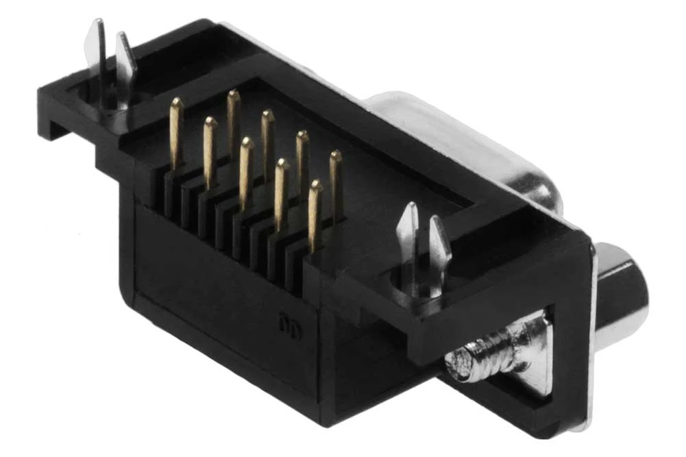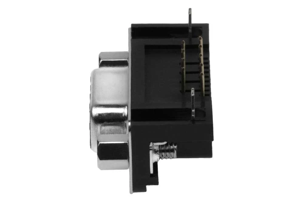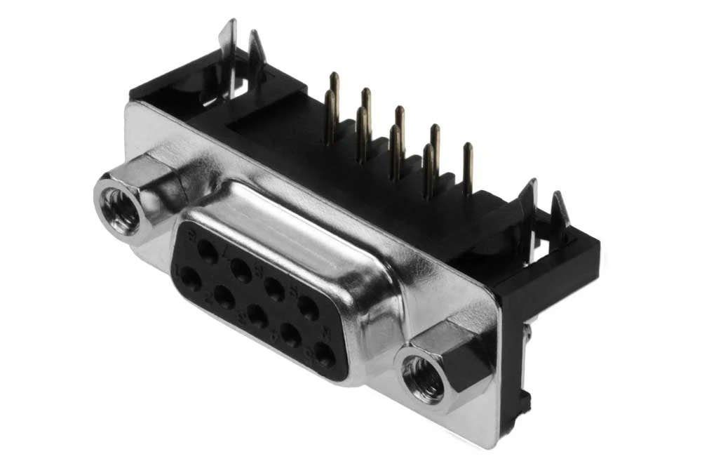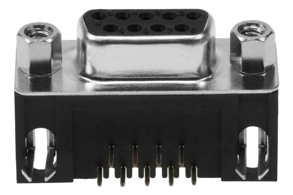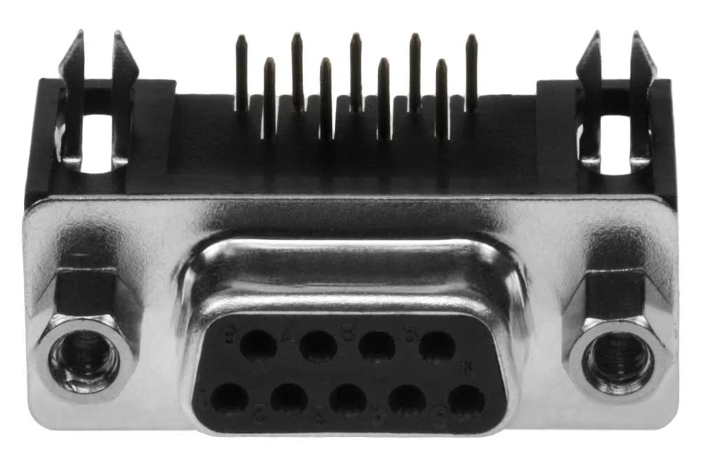 DB9 Female Right Angle Connector. Designed to be mounted on printed circuit boards.