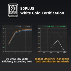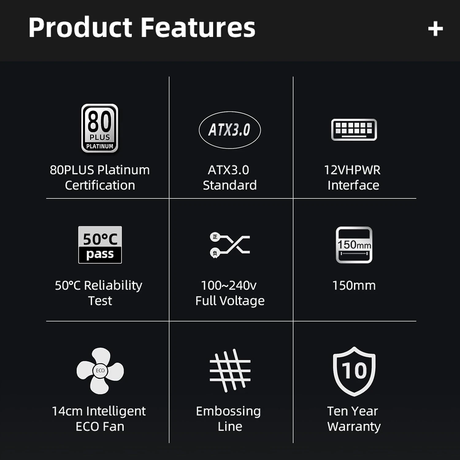 - 1. 80PLUS Platinum Certification: This power supply has passed the 80PLUS Platinum Certification, which demonstrates its excellent energy-saving and efficiency performance.