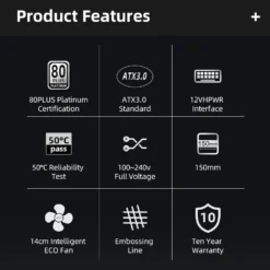 - 3. 14cm Smart ECO Fan: The power supply features a 14cm Smart ECO fan, which automatically adjusts the fan speed according to the load and temperature, achieving noise reduction and energy saving.